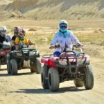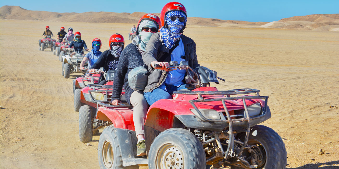 Learn how to drive a quad, then put on your gear and drive out to the desert. Discover the sandy desert and admire the surroundings with an exciting ride. Make new friends and meet some local Bedouins. Ride a camel in the desert as well. End the activity with a hotel drop-off back to Hurghada. Begin with hotel pickup. Then, set off to the desert. Listen to a quick health and safety briefing from your guide and hop onto your quad for a short driving test. After this, follow the guide out into the desert. Explore the sand and enjoy a bumpy ride while exploring your sandy surroundings. Meet some friendly Bedouins to learn about the local lifestyle. Hop onto a camel and enjoy a ride too. Finally, head back to your hotel at the end of the activity.